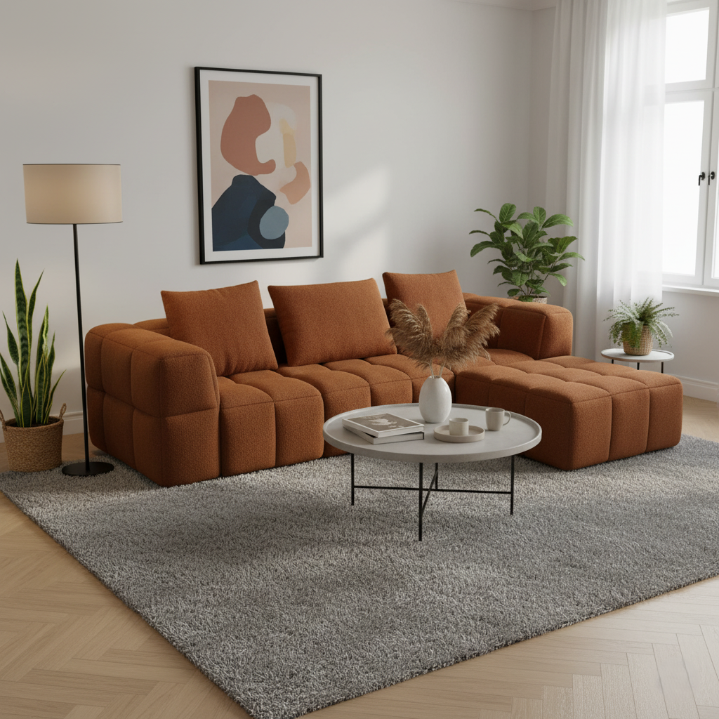 Ce canapé se distingue par ses lignes généreuses et son esthétique sculpturale pensée pour sublimer n’importe quel intérieur moderne. Son revêtement en tissu texturé offre un toucher doux et chaleureux, tandis que son capitonnage en larges carrés crée un visuel unique, à la fois minimaliste et sophistiqué.